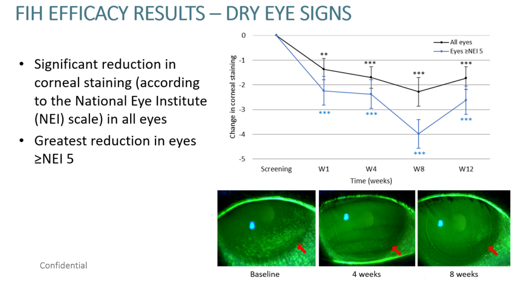 Two pre-pilot clinical studies have been completed. The first included 50 patients with moderate to severe dry eye disease and the second study (also with 50 patients) included a placebo or “sham” control group. Both studies were performed at three world renowned international sites without any adverse events or changes in safety-related endpoints or vital signs. The efficacy results showed significant reduction in corneal staining (a sign of dryness) in all eyes as well as an improved reported quality of life and an average reduction of 55% in lubricant use.